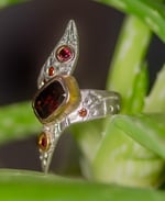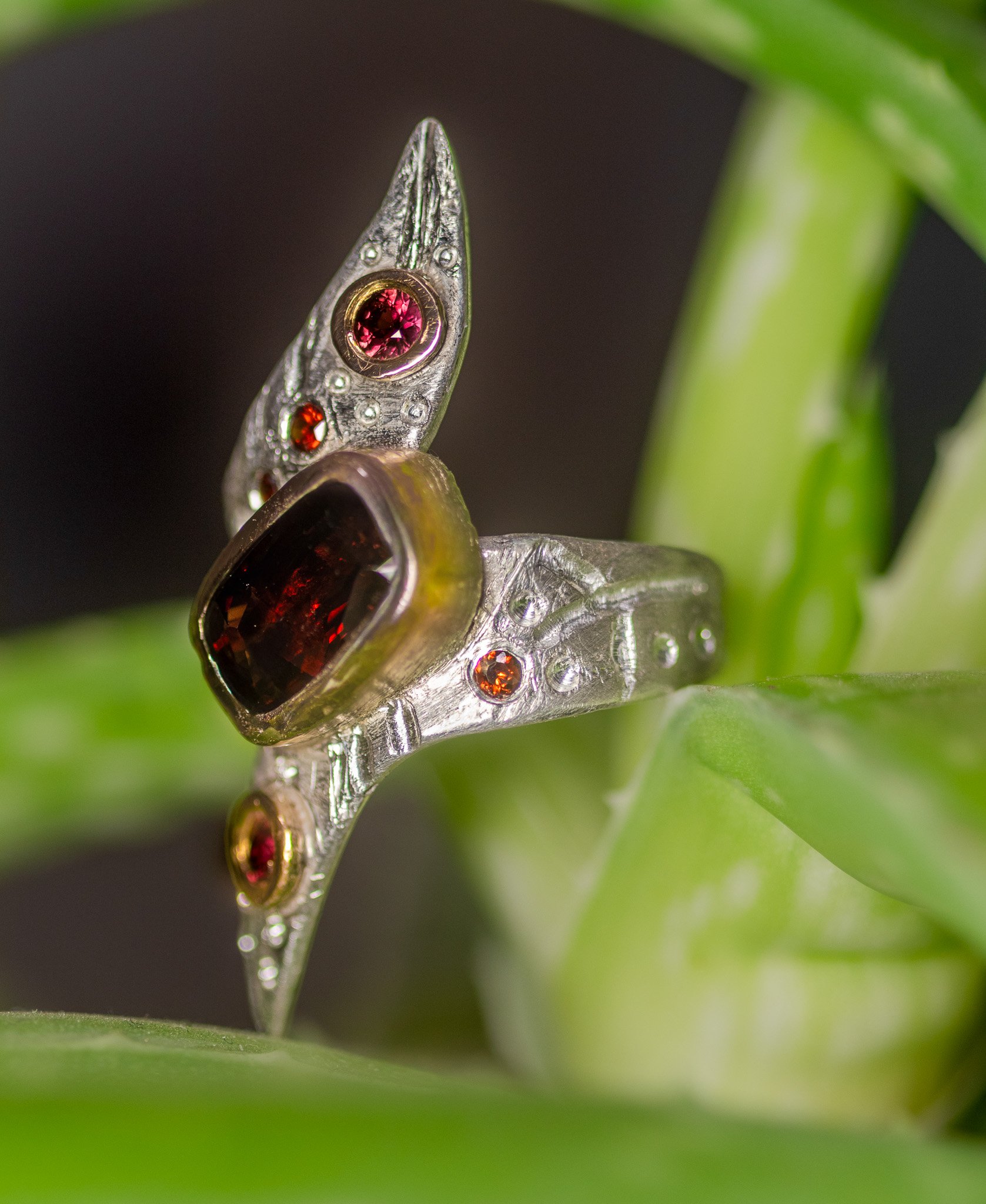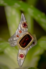A beautiful rectangular cut garnet that has been in my collection for 5 years is the main attraction in this twisty recycled metal number. Unique carvings and a few red sapphires and tiny garnets set off this very special one off.